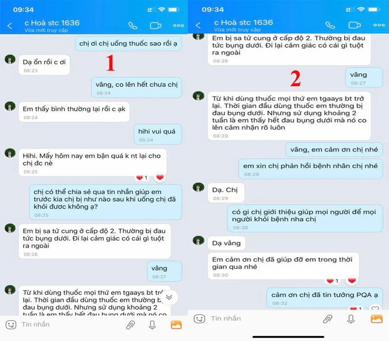 Ngày 15/4/2022 sau khi tìm hiểu chị Gọi về gặp DS Huế tư vấn. Chị bị sa tử cung độ 2. Ban đầu chị băn khoăn lắm: không biết nghe DS HUẾ Có dc không? Khỏi bệnh không? Điều tuyệt vời nhất chị đã hết bệnh – Dược Sĩ Huế quá mát tay . Gần 1 năm rồi chị nhắn tin cảm ơn lần thứ n..