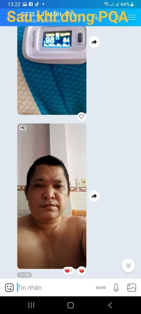 Bác bị Bệnh phổi tắc nghẽn mãn tính COPD thường xuyên ho nhiều, khó thở, định kỳ hàng tháng vào viện 1 – 2 lần. Tháng 7.2019, sau khi tìm hiểu và được Dược sỹ tư vấn của PQA tư vấn cho chị PQA Hoàng Kim + PQA Hoàng kỳ. Chỉ sau 1 tháng rưỡi, sức khỏe Bác đã được cải thiện rõ rệt. Bác đã kiên trì dùng liên tục trong vòng 5 tháng, và từ đó đến nay ông không còn ho, khó thở, và đương nhiên cũng không còn phải nhập viện để cấp cứu nữa. Các con của bác rất vui mừng và hẹn một ngày gần nhất sẽ đưa bác về thăm PQA để cảm ơn đội ngũ cán bộ công nhân viên của PQA chúng tôi“