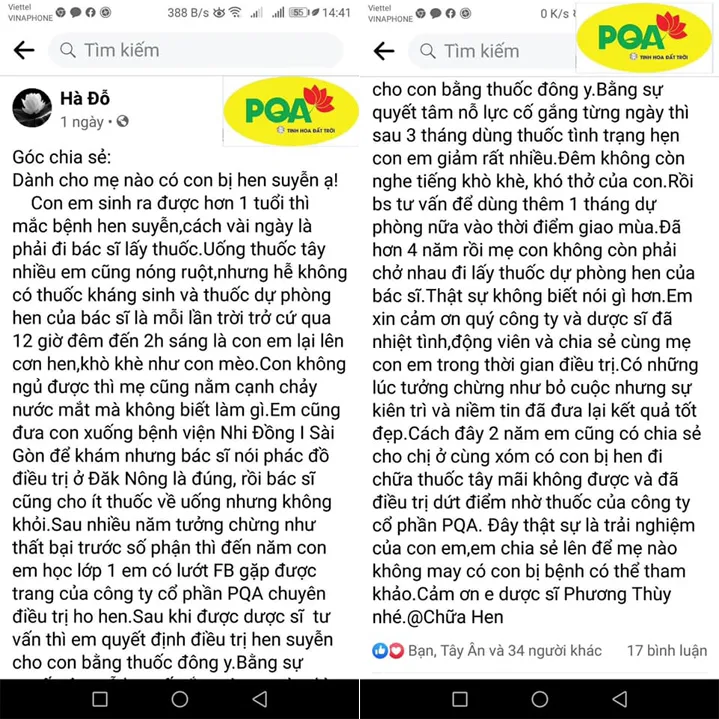 Sản phẩm PQA Hen Suyễn giúp kiểm soát hiệu quả cơn hen, vừa không bị tác dụng phụ, vừa an toàn khi dùng thuốc, vừa giúp bệnh nhân tự tin hòa nhập cộng đồng – thoát khỏi nỗi tự ti khi phải ghồng ghánh căn bệnh hen suyễn, hen phế quản bao nhiêu năm qua