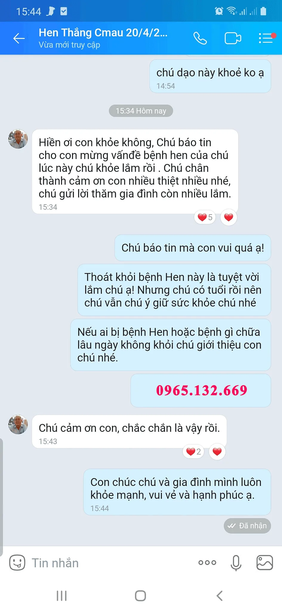 Nhờ có duyên mà Bác biết đến chúng tôi. Sau khi được các Dược sỹ Đại học tư vấn, Bác quyết tâm điều trị. Niềm vui vỡ òa khi sau 3 tháng, Bác đã gọi điện về Công ty để “Cám ơn cái Xí nghiệp có thuốc quá tốt để giúp những người bệnh hen suyễn như tôi được hết bệnh”!